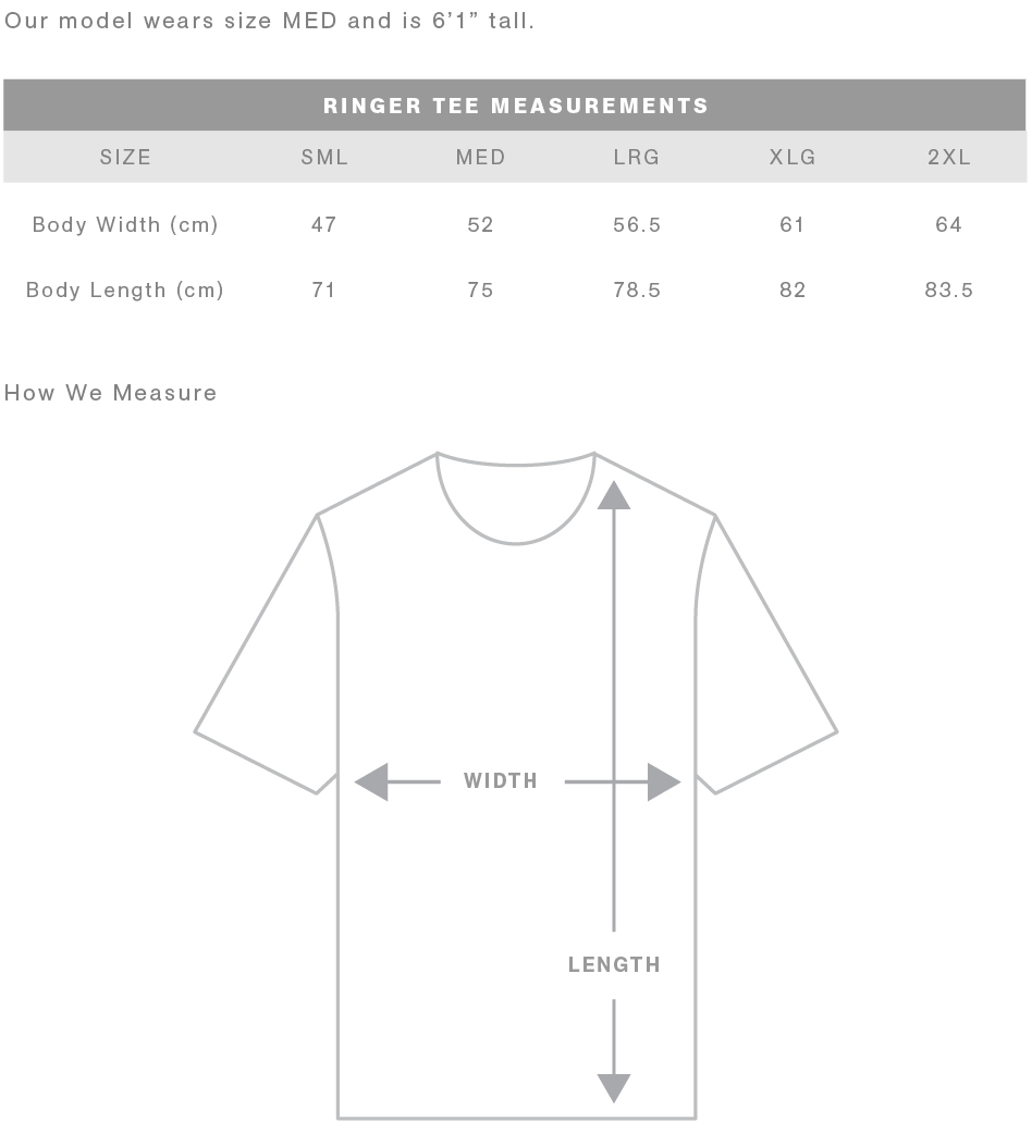 FIT: Regular fit - please check the size chart to avoid disappointment. Lay your own tee flat on a table, measure armpit to armpit across the chest and match to the size you feel is best. Please note measurements can vary within 2.5cm, this is within the accepted tolerance.